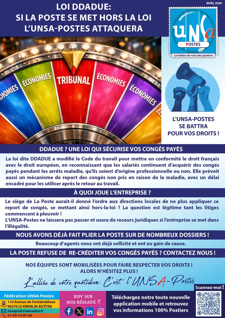 🚨Loi DDADUE: Si La Poste se met hors la loi et met vos droits à congés en péril, l’UNSA-Postes attaquera