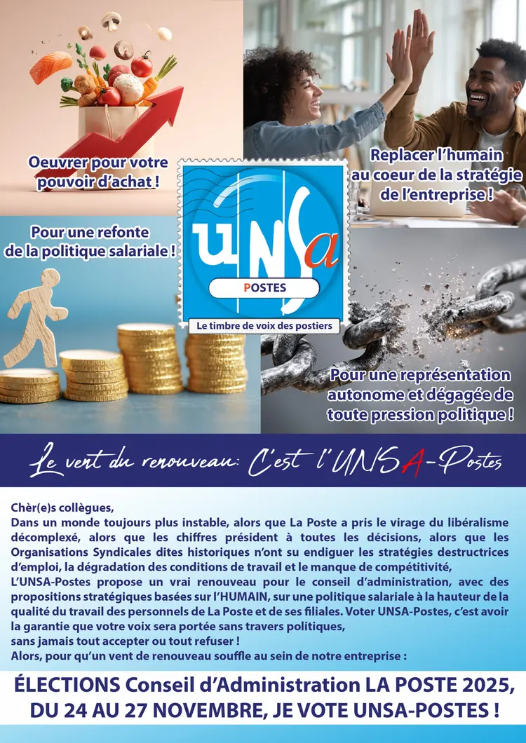 🚨Élections au Conseil d’administration de La Poste: Et si un vent de renouveau venait changer la donne ?Du 24 au 27 Novembre 2025: Ensemble, on vote et on fait voter UNSA Postes 🩵